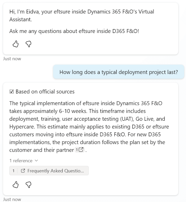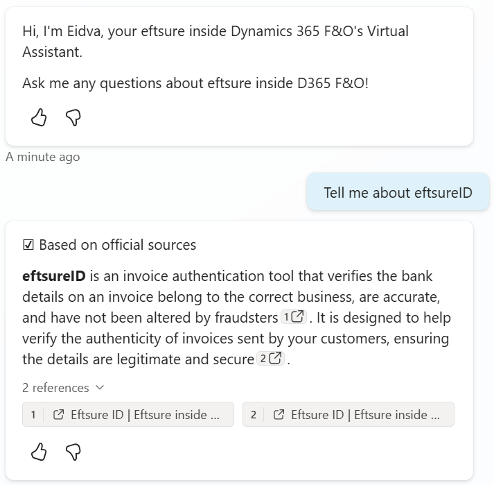 Your Copilot agent will be able to answer your user's questions about Eftsure, including answers based on our online documentation.